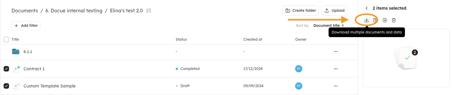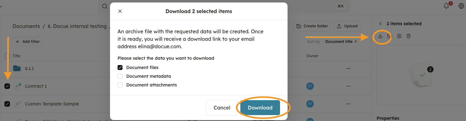 We recommend keeping your contracts organised in one place by using Docue's secure archive. However, if you need to download documents from your Docue workspace, you can select multiple documents at once by using the multi select tool and download everything to your email all at once. Downloading documents at once speeds up the downloading process and makes data management easier.