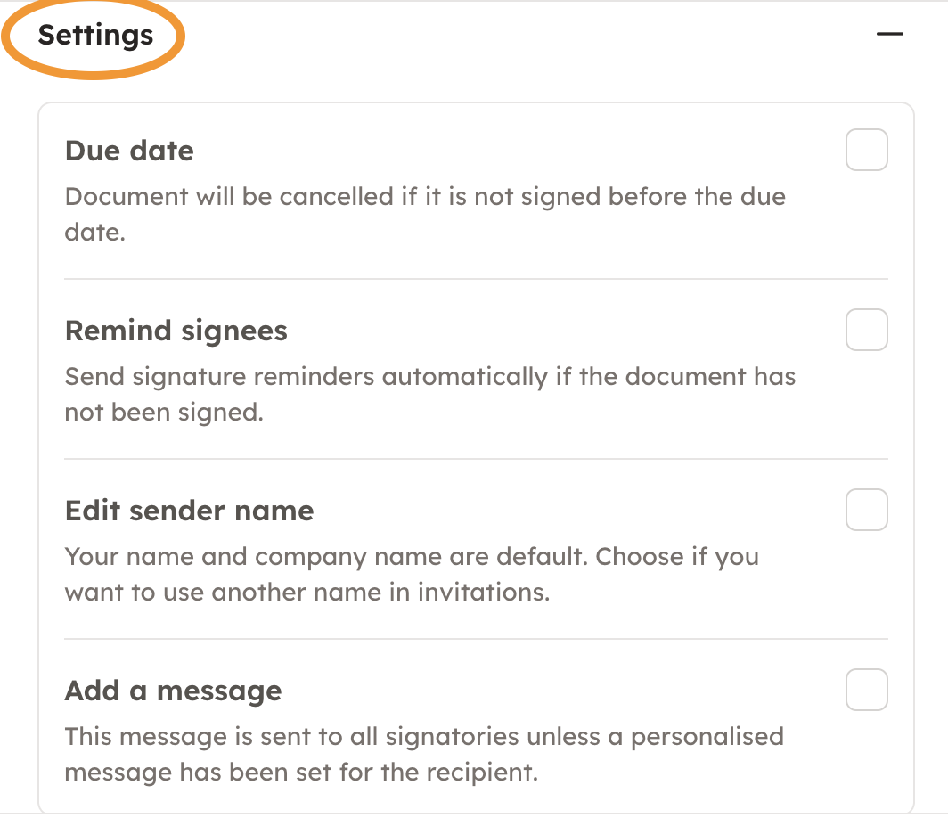 7. You can modify the invite in the invite settings. By choosing a due date, the document will be cancelled automatically if it is not signed before the due date. You can also choose to remind the signees sign automatically. If you want, you can also edit the sender name, and add a message to all signatories, unless a personalized message has been set for the recipient.