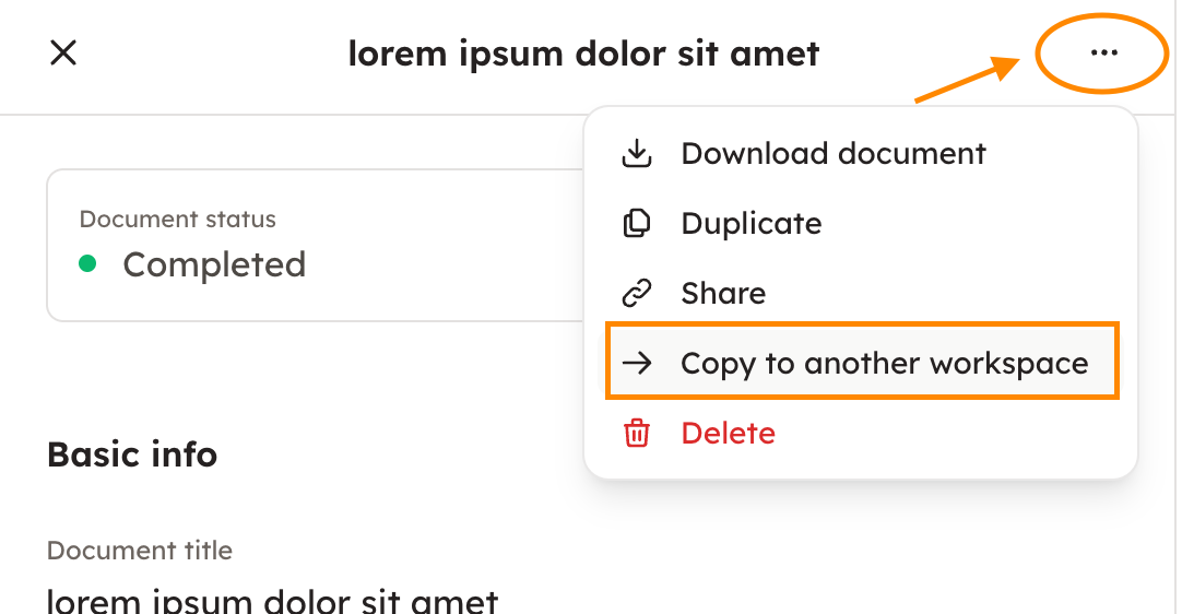 If you have access to multiple workspaces, you can copy finished documents from one workspace to another. First go to "All documents", and click the document you wish to copy from this workspace to another one. After that, choose three dots from the upper right corner, and "Copy to another workspace".