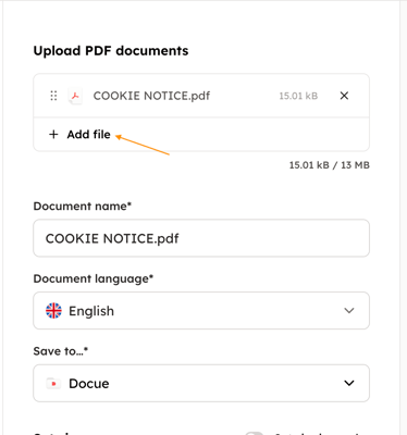 2. When imported, the language and name of the document can be changed. By clicking "Add file" you can add more documents as attachments to the document that needs to be signed. The maximum file size shouldn't exceed 13MB.