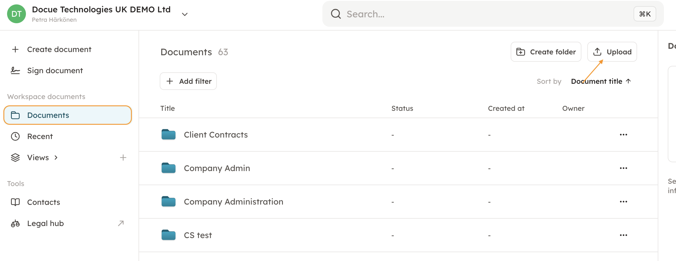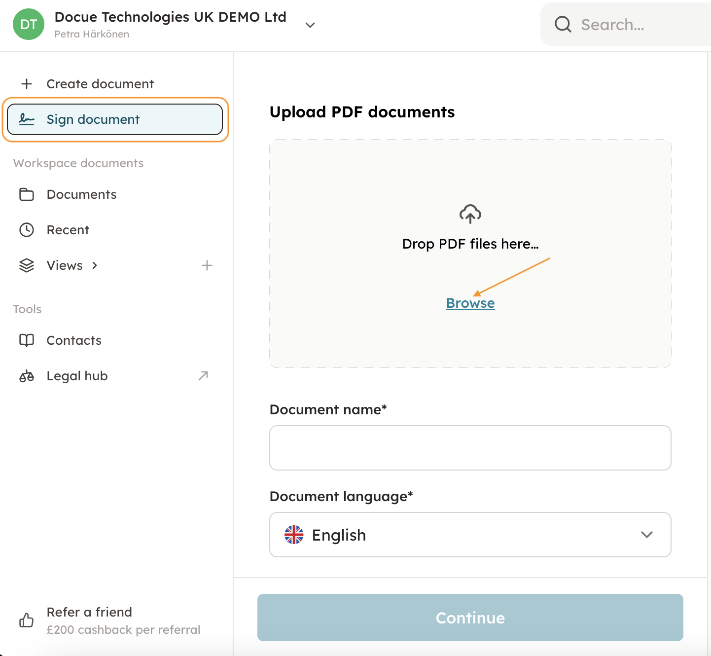 The Docue e-sign is available from the front page view in "Sign document".