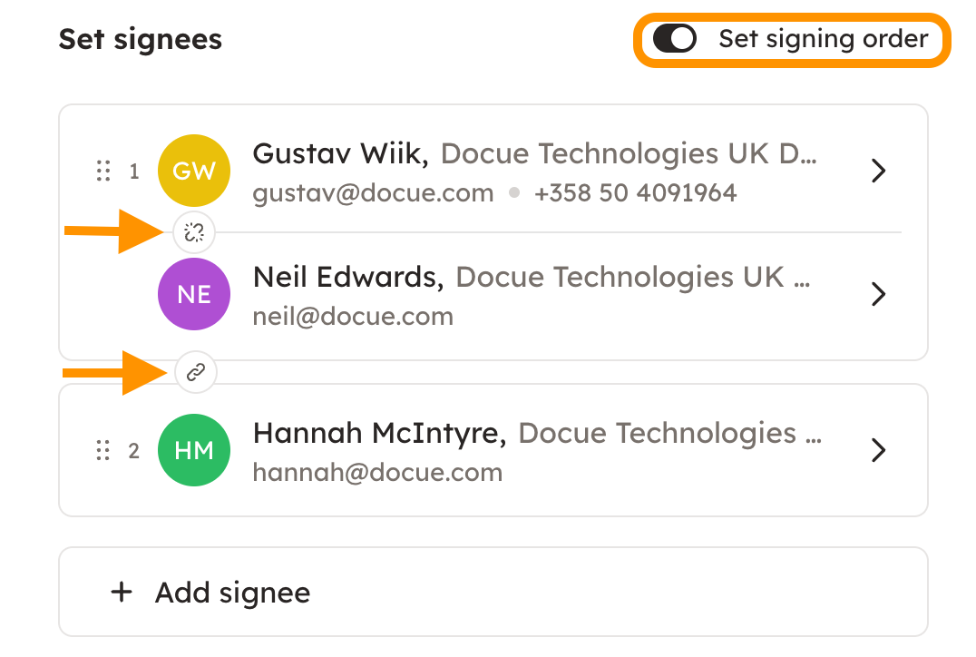 4. If you want to, you can set a signing order for the signees. By setting a signing order, the signing invites are automatically sent out in the order you choose (as soon as group 1 has signed, group 2 will get the invite). Groups are created by clicking the "clips" marked by the arrows (pictured below). You can change the order of groups by dragging the signees up and down.