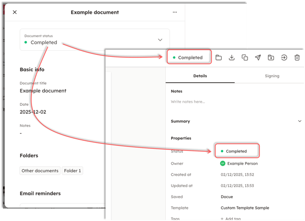 The document's information is located on the right side of the PDF file in Docue Drive. Here you will find the familiar information about the document (status, date, name), the document creator ("Owner"), and signature-related information.