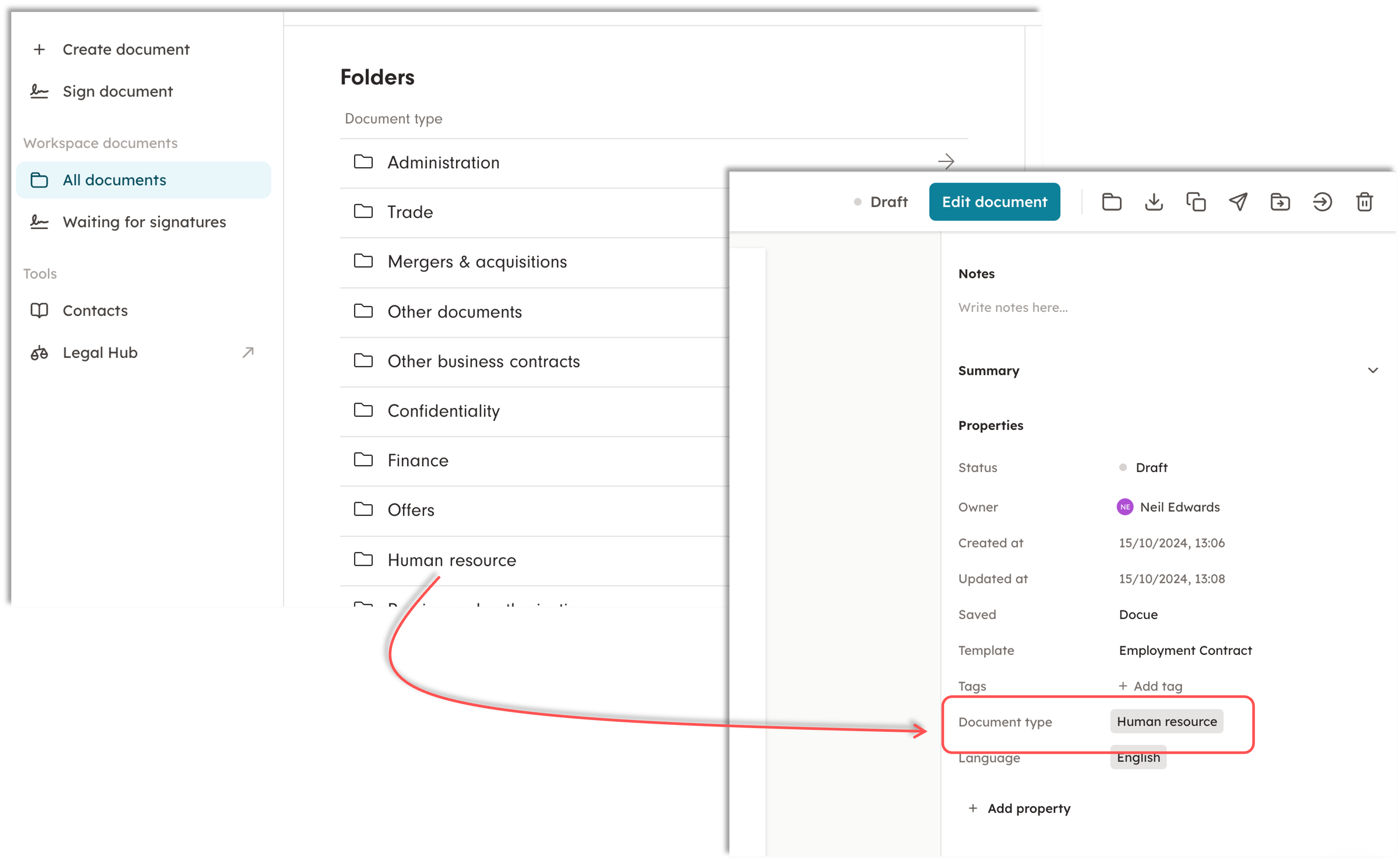When the workspace is updated to Docue Drive, the folder groups "Document type" will no longer be folders, but "Properties".