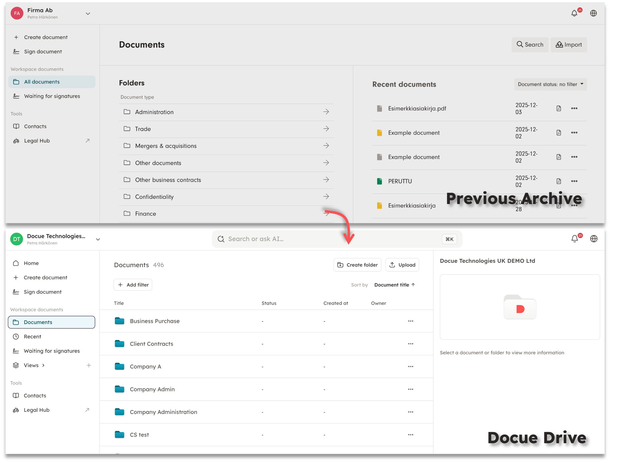 Keywords: Docue Drive, archive, new archive, old archive, previous archive, legacy archive, where, folders, folder group, where are my documents, migration, update, change, filters, AI assistant, duplicating document, all documents -view, document type