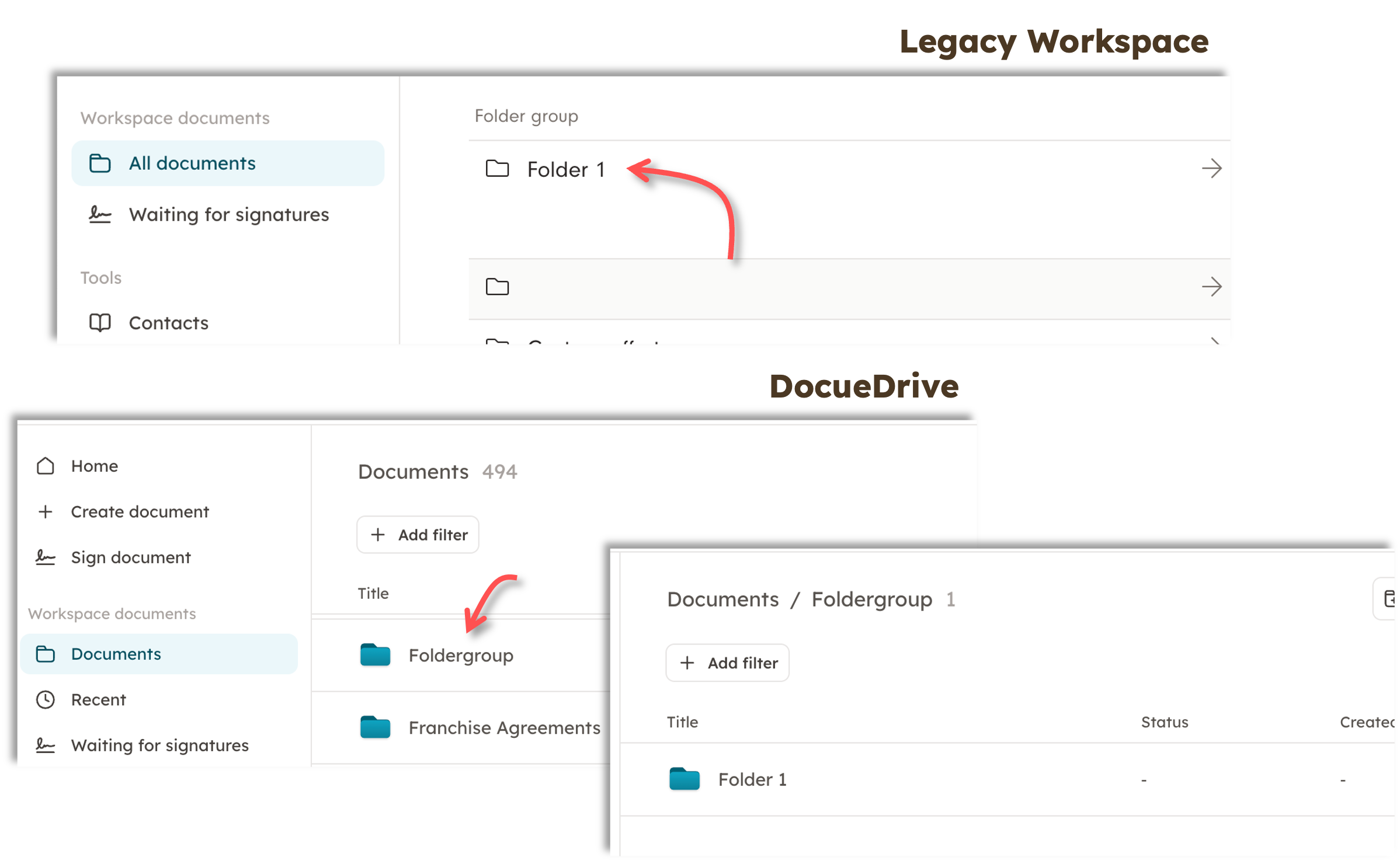 During the Docue Drive migration, the folder groups on the workspace become the workspace's folders, and the folders that were previously within the folder groups become subfolders under these.