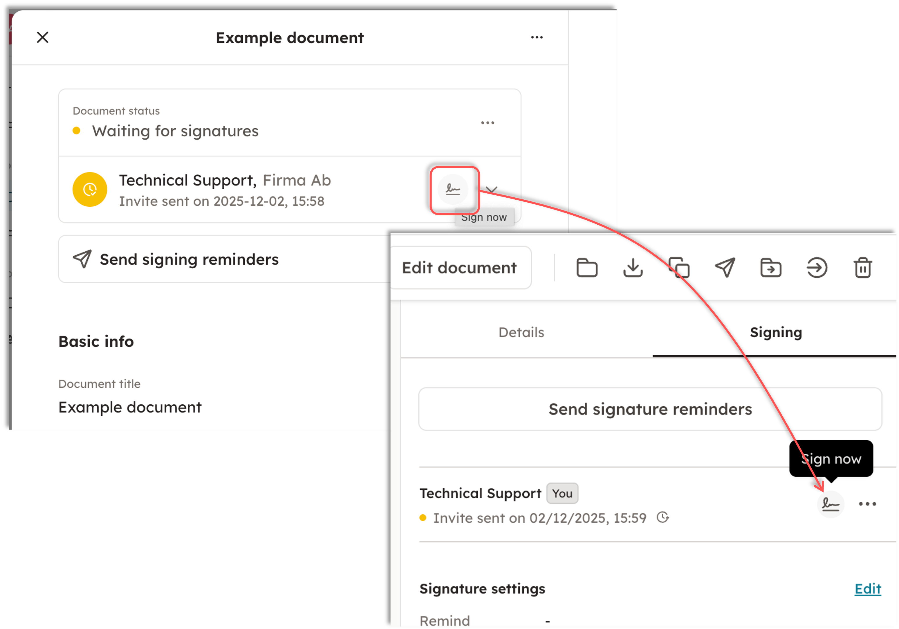 In Docue Drive, the signatory information is found on the right side of the PDF view under "Signing." From this view, you can check when the parties have signed, send signature reminders, and sign the document yourself, if you are a party to it.
