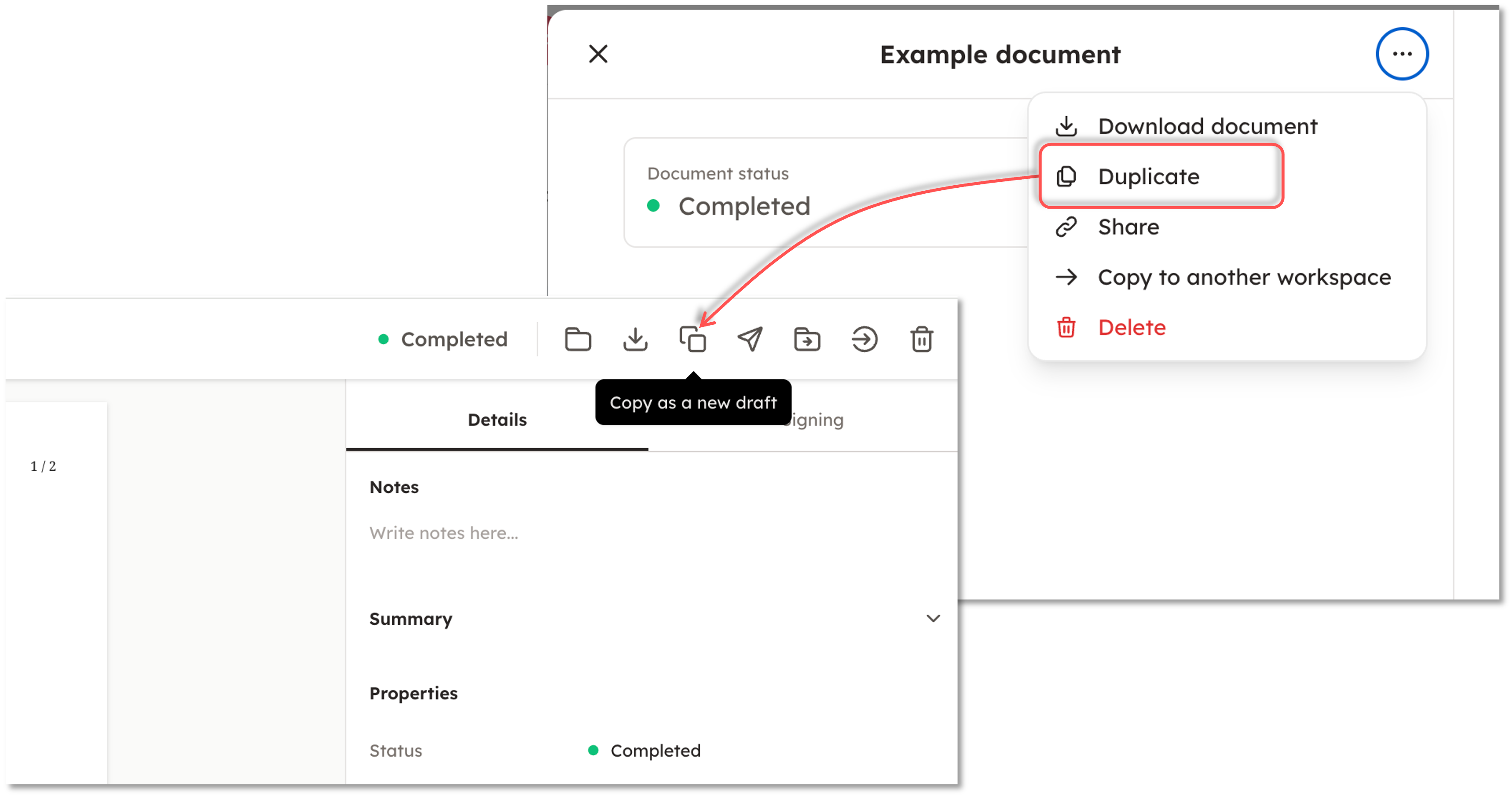 In Docue Drive, a document can be duplicated under "Copy as a new draft." This is found in the top bar when you open the document.