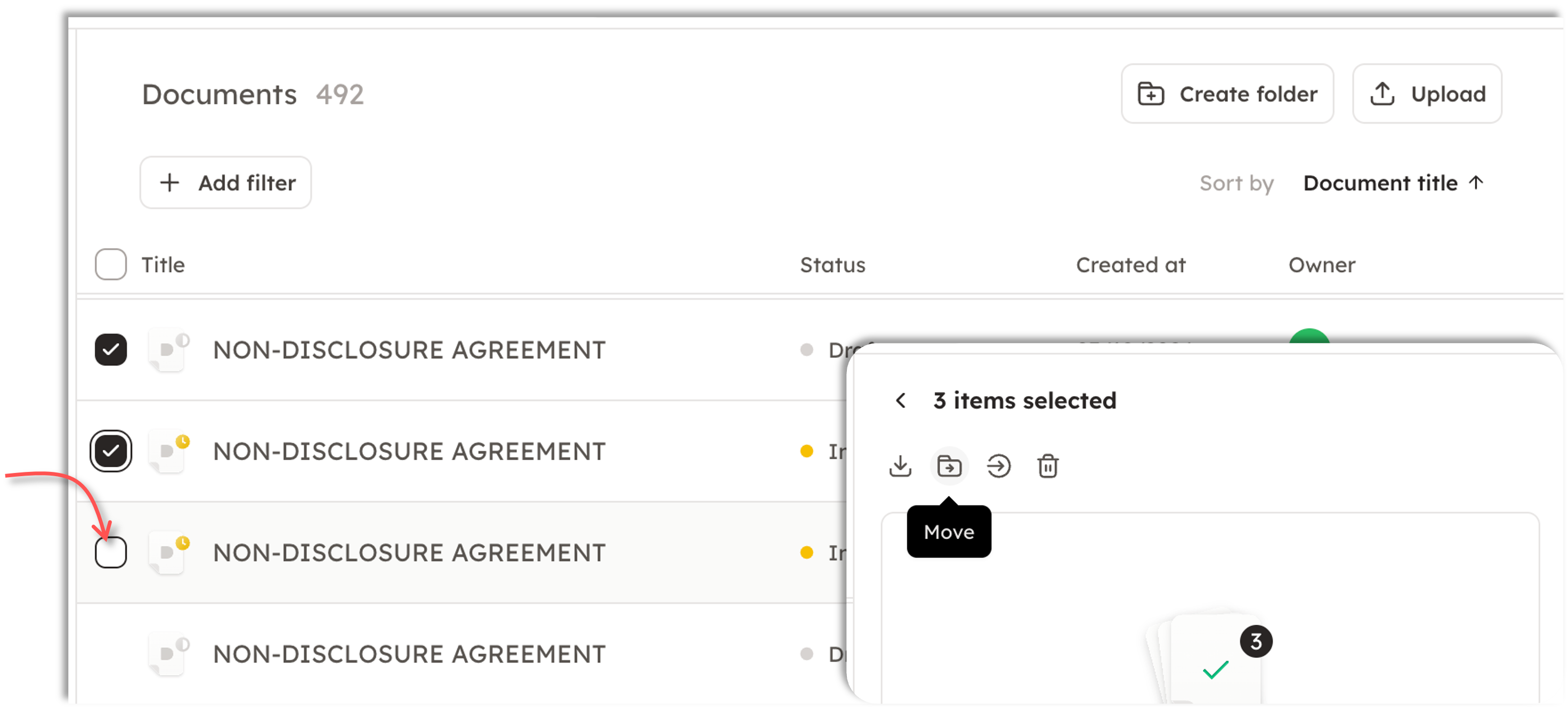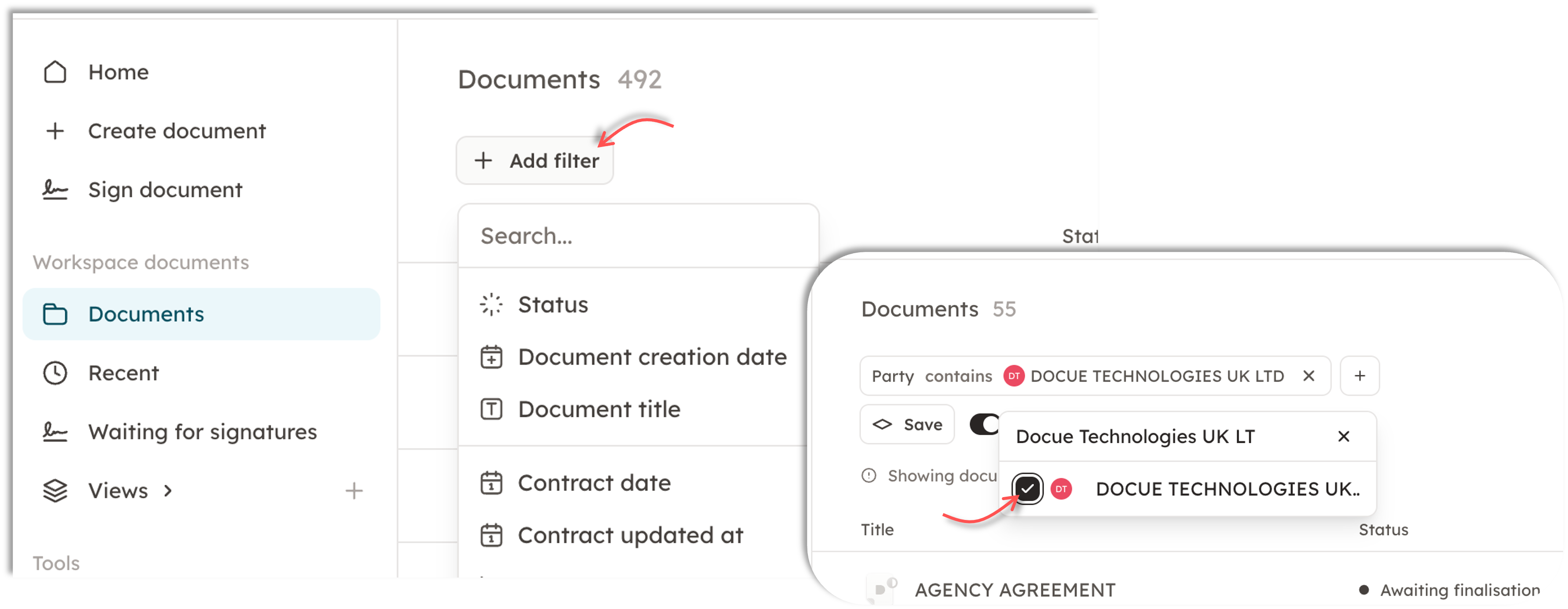You can filter documents based on, for example, the document owner (creator), document parties, signature date, or name.