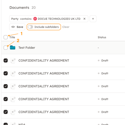 b) Once you have filtered the documents, click on the box next to "Title". This will select all the documents. Keep in mind, that if you have not included subfolders to the search, selecting all will also include all folders. So be sure to deselect them if you don't want to move those to the same folder.