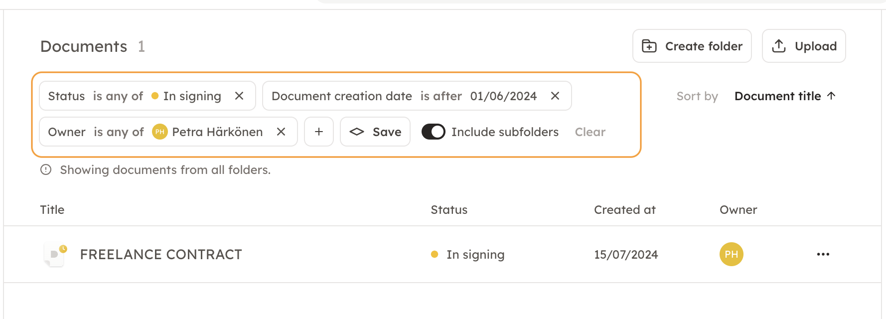 You can use multiple filters to narrow down your search based on various criteria, which significantly simplifies the process. For example, if you want to find documents that are at the signing stage and were created by a specific person after a certain date, you can do this using three filters.