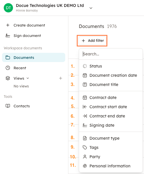 Searching for contracts in Docue Drive by using filters.