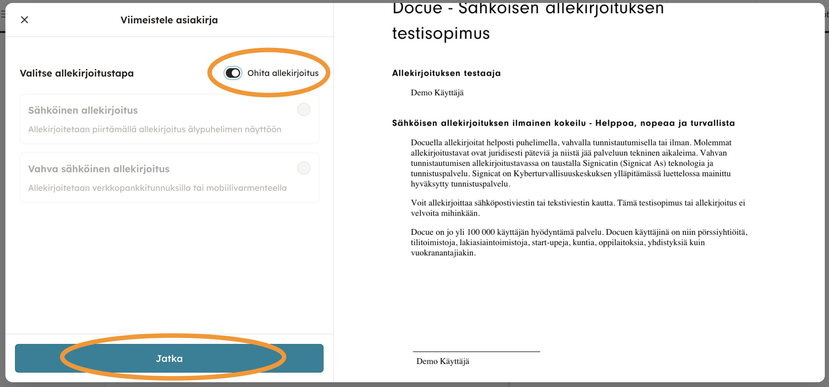 1. Kun laatimasi asiakirja on allekirjoituksia vaille valmis, viimeistele se painamalla laatimisnäkymän lopusta löytyvää "Jatka"-painiketta.