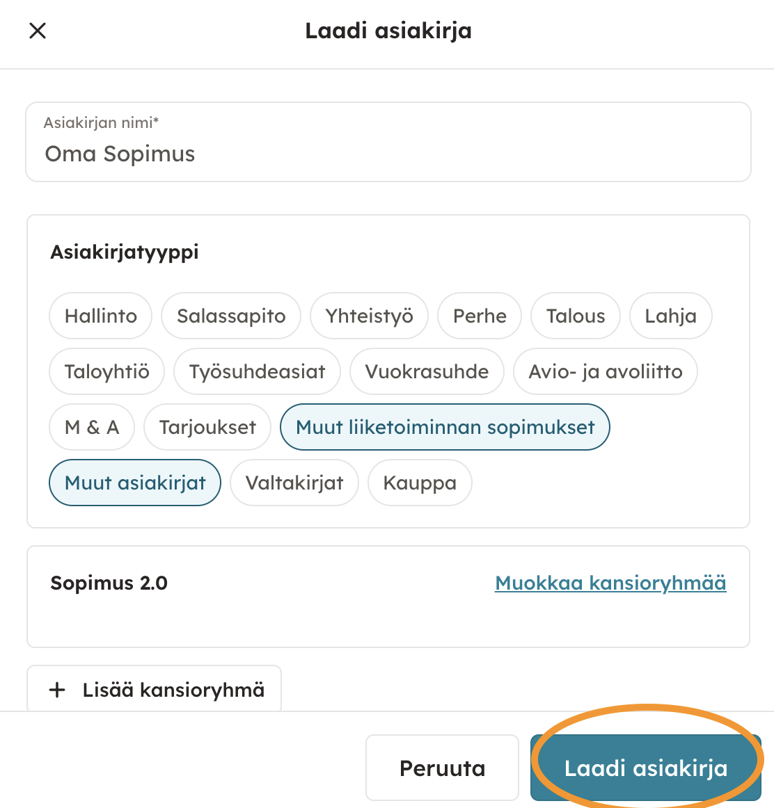 3. Valitse, mihin kansioon haluat arkistoida asiakirjasi ja jatka valitsemalla "Laadi asiakirja. Lisätietoa asiakirjojen arkistoitumisesta kansioihin.