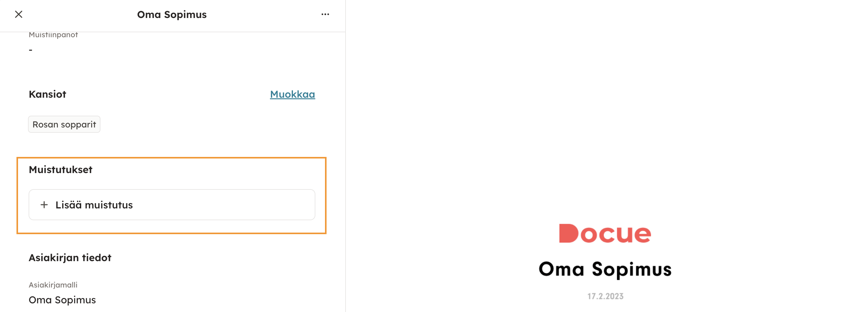 Asiakirja on nyt tallentunut palvelun Asiakirjat -osioon (arkisto). Voit asettaa tuoduille tiedostoille muistutuksia asiakirjakortilta kohdasta "Lisää muistutus". Saat asiakirjakortin auki klikkaamalla asiakirjan nimeä arkistossa. Voit lisäksi kirjoittaa asiakirjakortille omia muistiinpanoja.