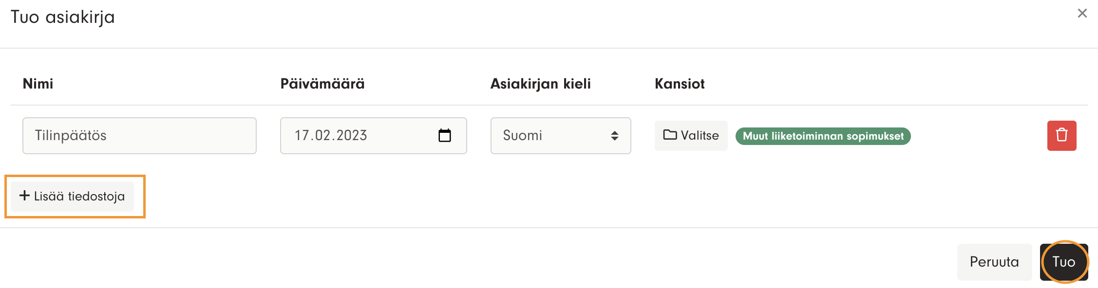 Valitse tiedosto laitteeltasi ja muokkaa tarvittaessa asiakirjan arkistointitietoja. Voit tuoda yhdellä kertaa enimmillään kymmenen tiedostoa "Lisää tiedostoja" -toiminnon avulla. Paina lopuksi "Tuo".