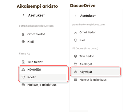 DocueDrivessa käyttäjiä hallinnoidaan ainoastaan "Käyttäjät" valikosta asetusten takaa. Eli "Roolit" valikko on kokonaan hävinnyt aikaisempaan arkistoon verrattuna.