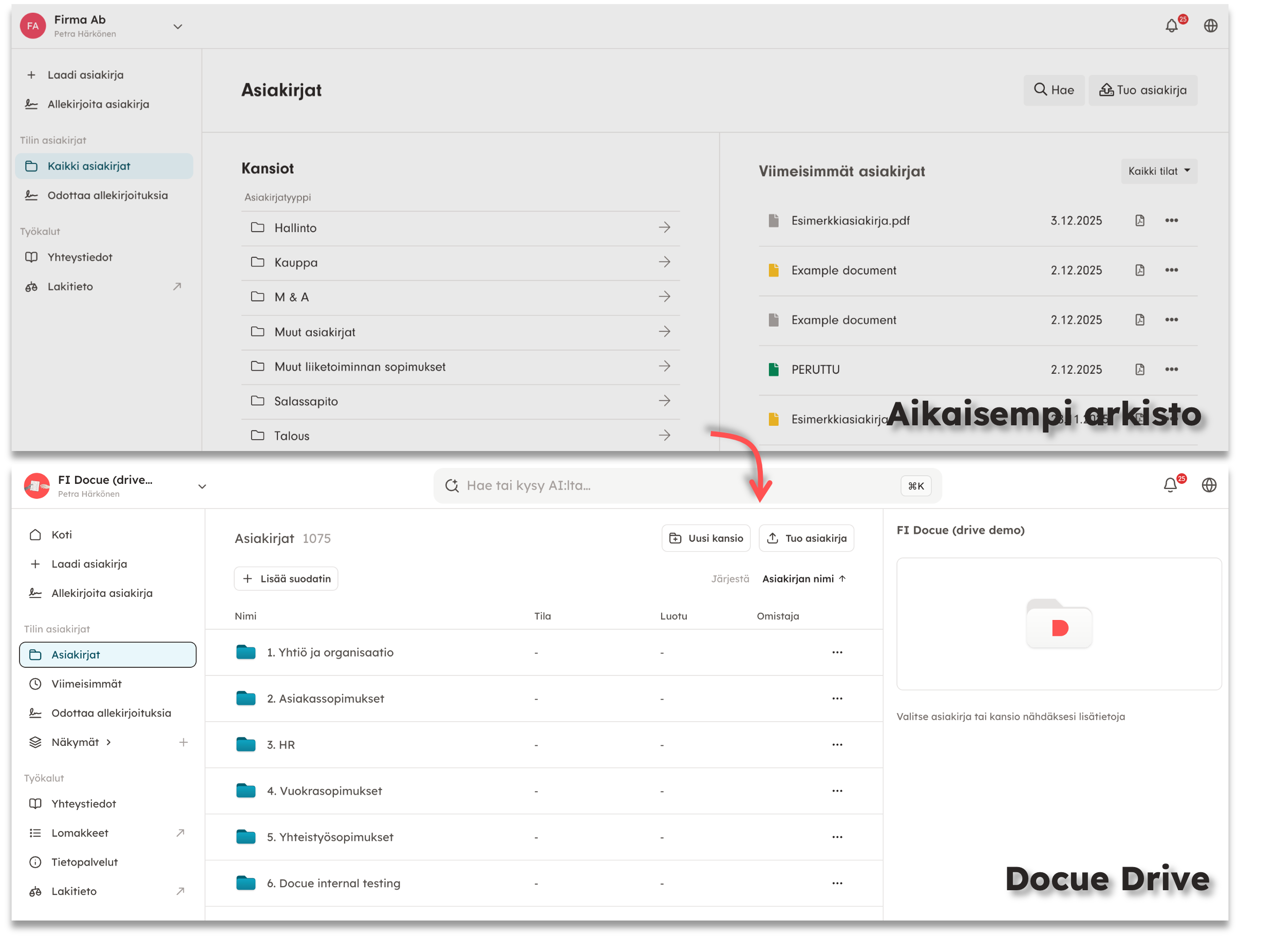Asiasanat: DocueDrive, Drive, päivitys, päivitetty, eroavaisuudet, erot, muutos, vanha arkisto, aikaisempi arkisto, sähköinen arkisto, asiakirjatyyppi, kansio, kansiot, käyttäjät, käyttäjien hallinta, muistutukset, suodattimet, tekoälyapuri, allekirjoitustiedot, asiakirjakortti, mistä löydän asiakirjat, missä