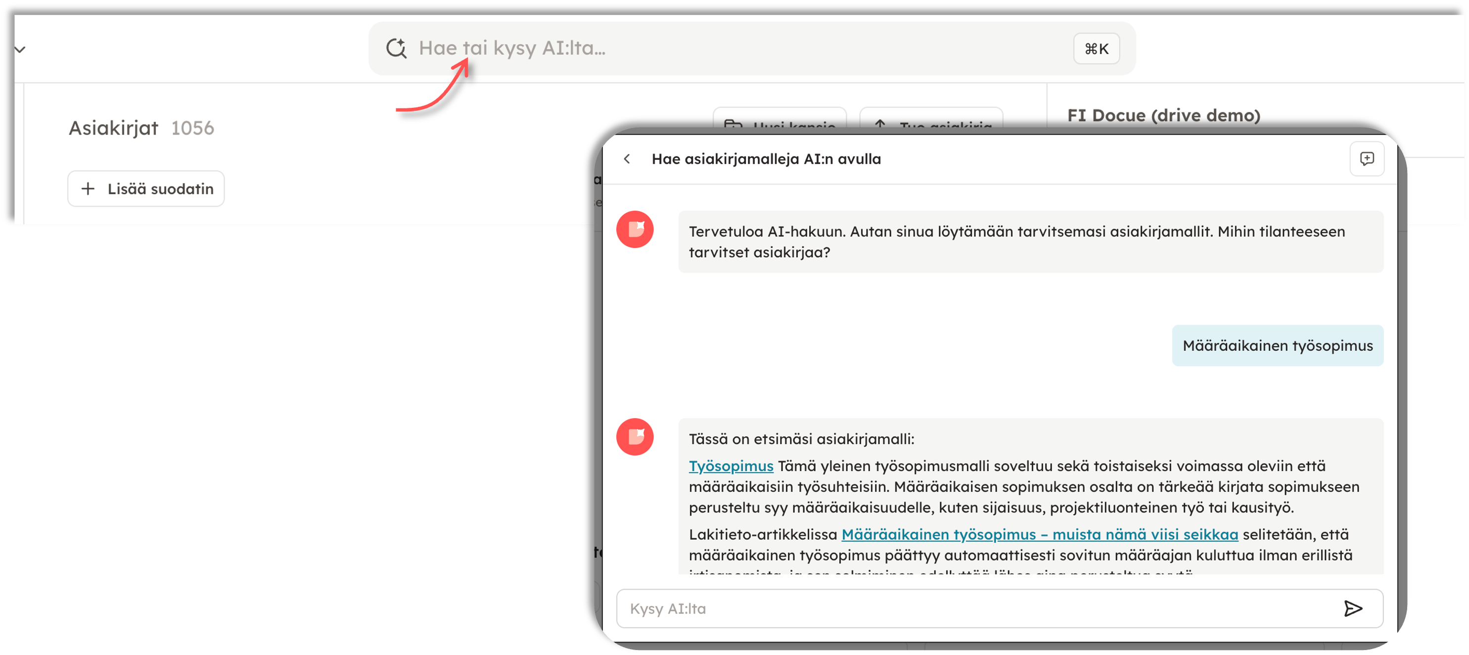 Palvelun hakutoiminnon lisäksi asiakirjamalleja voi etsiä nykyään tekoälyapurin avulla.