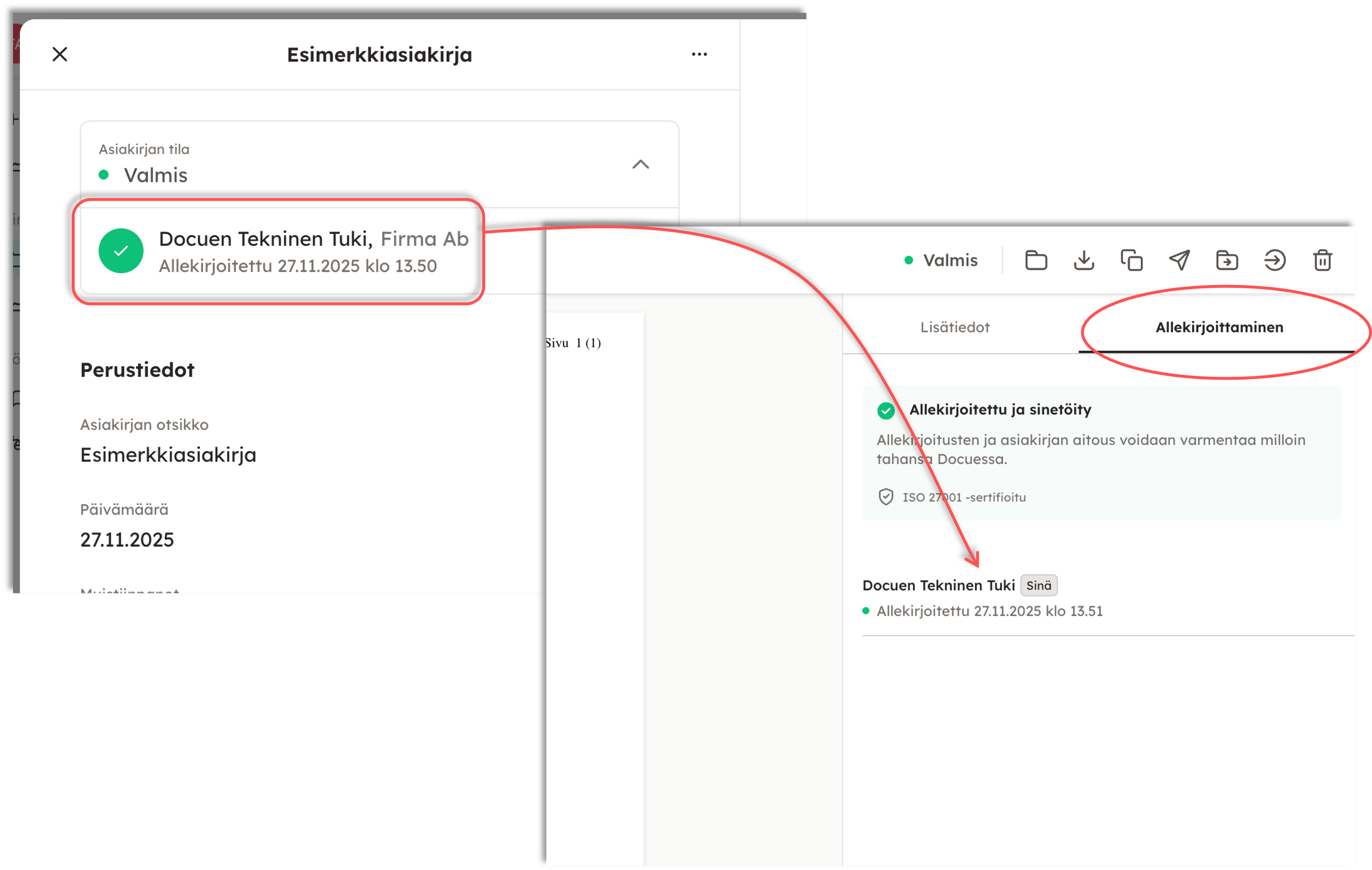 DocueDrivessa allekirjoittajan tiedot löytyvät pdf-näkymästä oikealta kohdasta "Allekirjoittaminen". Tästä näkymästä pääset tarkistamaan, milloin osapuolet ovat allekirjoittaneet, lähettämään allekirjoitusmuistutuksia, sekä allekirjoittamaan itse asiakirjan, mikäli olet siinä osapuolena.