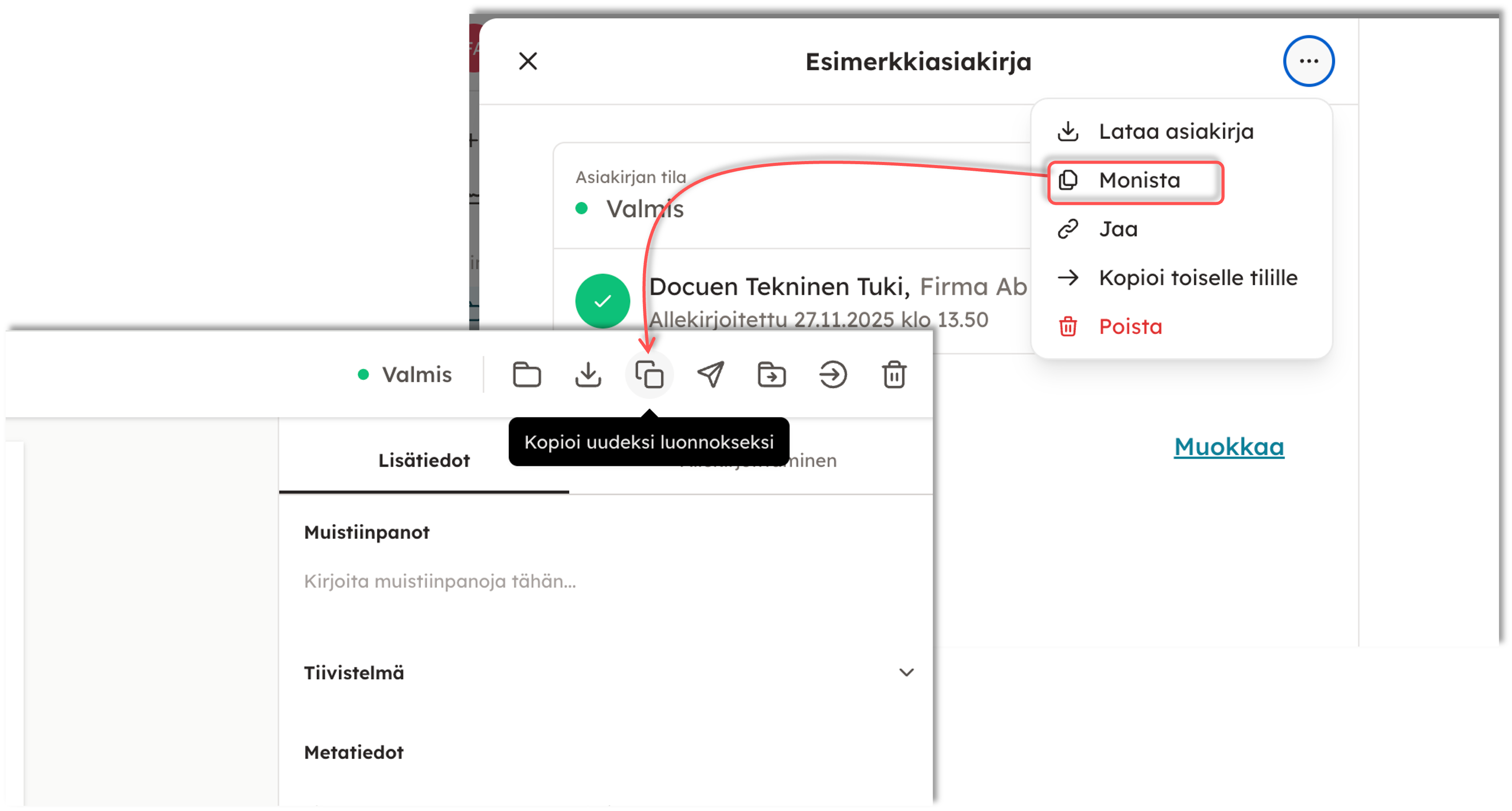 DocueDrivessa asiakirjan saa monistettua kohdasta "Kopioi uudeksi luonnokseksi". Tämä löytyy yläpalkista kun avaat asiakirjan.