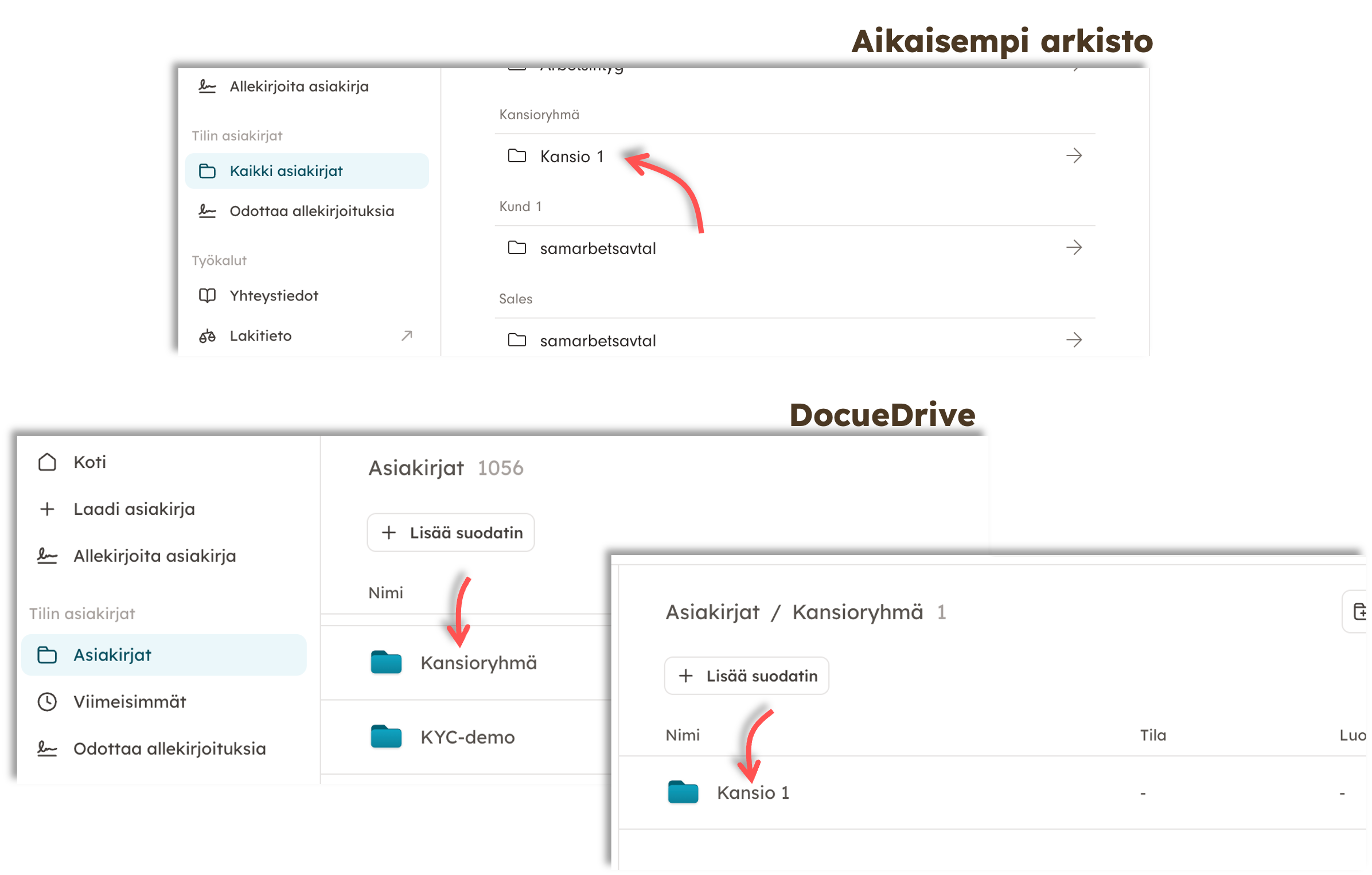 DocueDriven siirron aikana tilillä olevista kansioryhmistä muodostuvat tilin kansiot, ja aikaisemmassa kansioryhmässä olleista kansioista, näiden alle alakansiot.