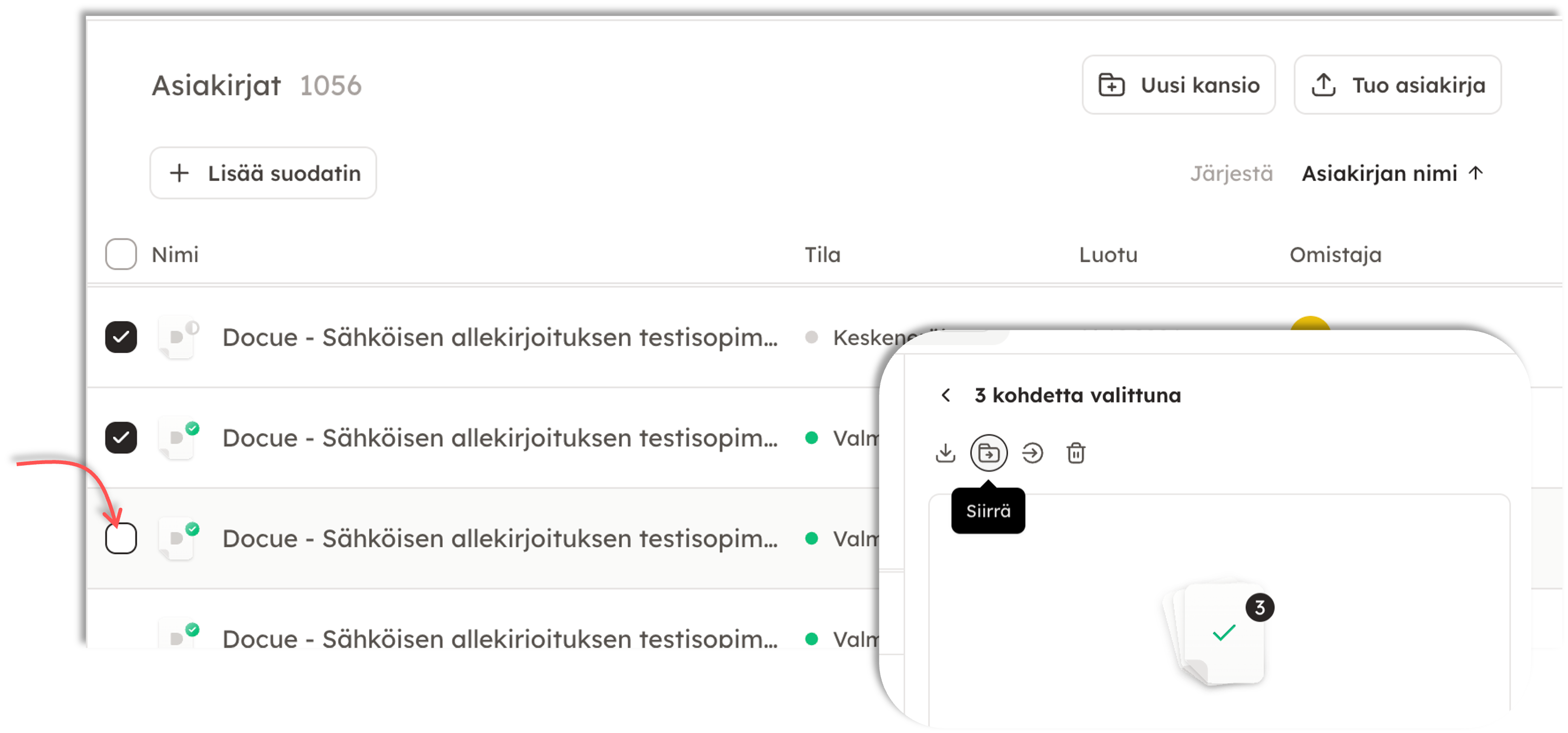 DocueDrivessa asiakirjoja pystyy valita useita samanaikaisesti. Tämä mahdollistaa asiakirjojen lataamisen, siirron ja poistamisen massana. Näin asiakirjojen uudelleenkansiointi tai -järjestely onnistuu vaivatta.