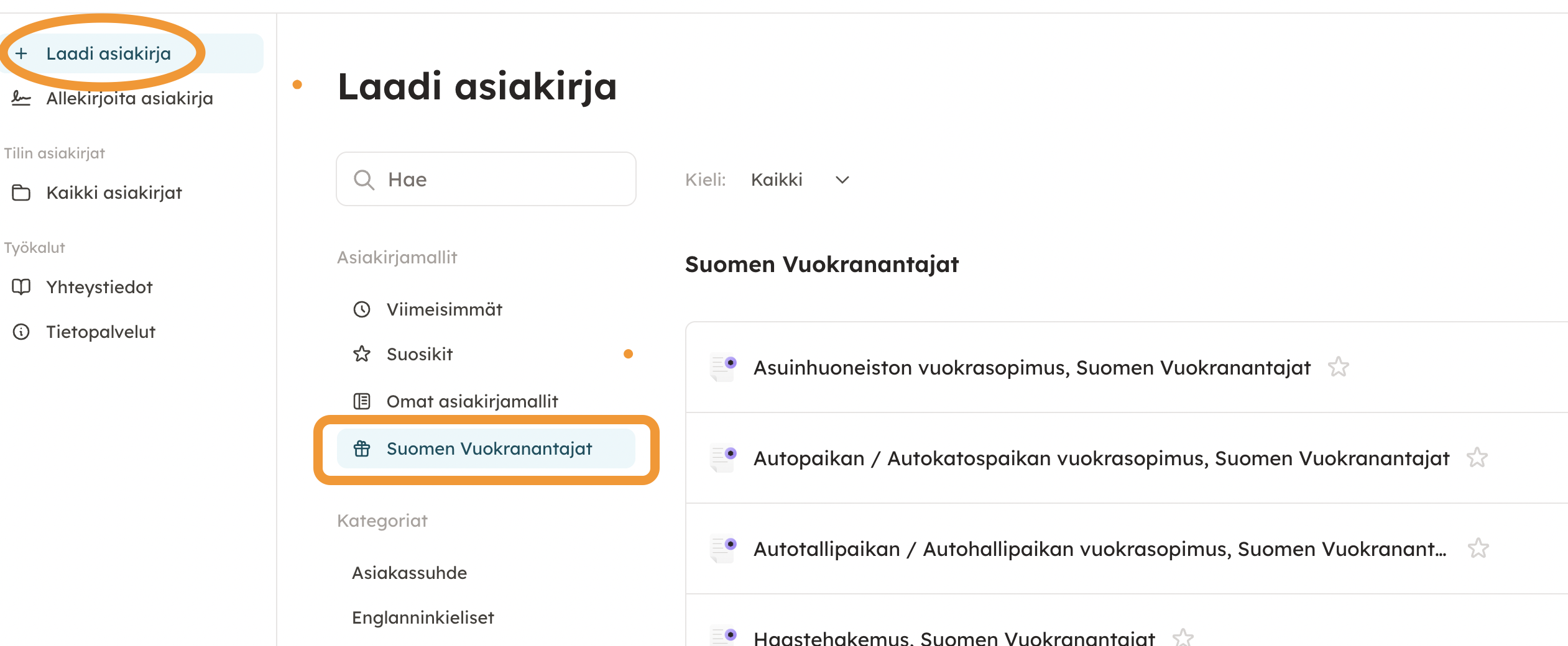 Kun Docuen käyttäjätunnuksellesi on aktivoitu Suomen Vuokranantajat ry:n jäsenetu, löydät etuun sisältyvät asiakirjamallit palvelusta alla olevan kuvan mukaisesta kohdasta.