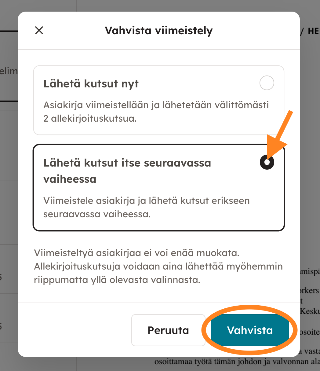 2. Seuraavaksi valitse allekirjoitustapa. Tässä näkymässä on myös vielä mahdollisuus tarkistaa asiakirjan sisältö ja palata muokkaamaan sulkemalla viimeistelyikkuna vasemman yläkulman ruksista, mikäli muokattavaa vielä ilmenee.