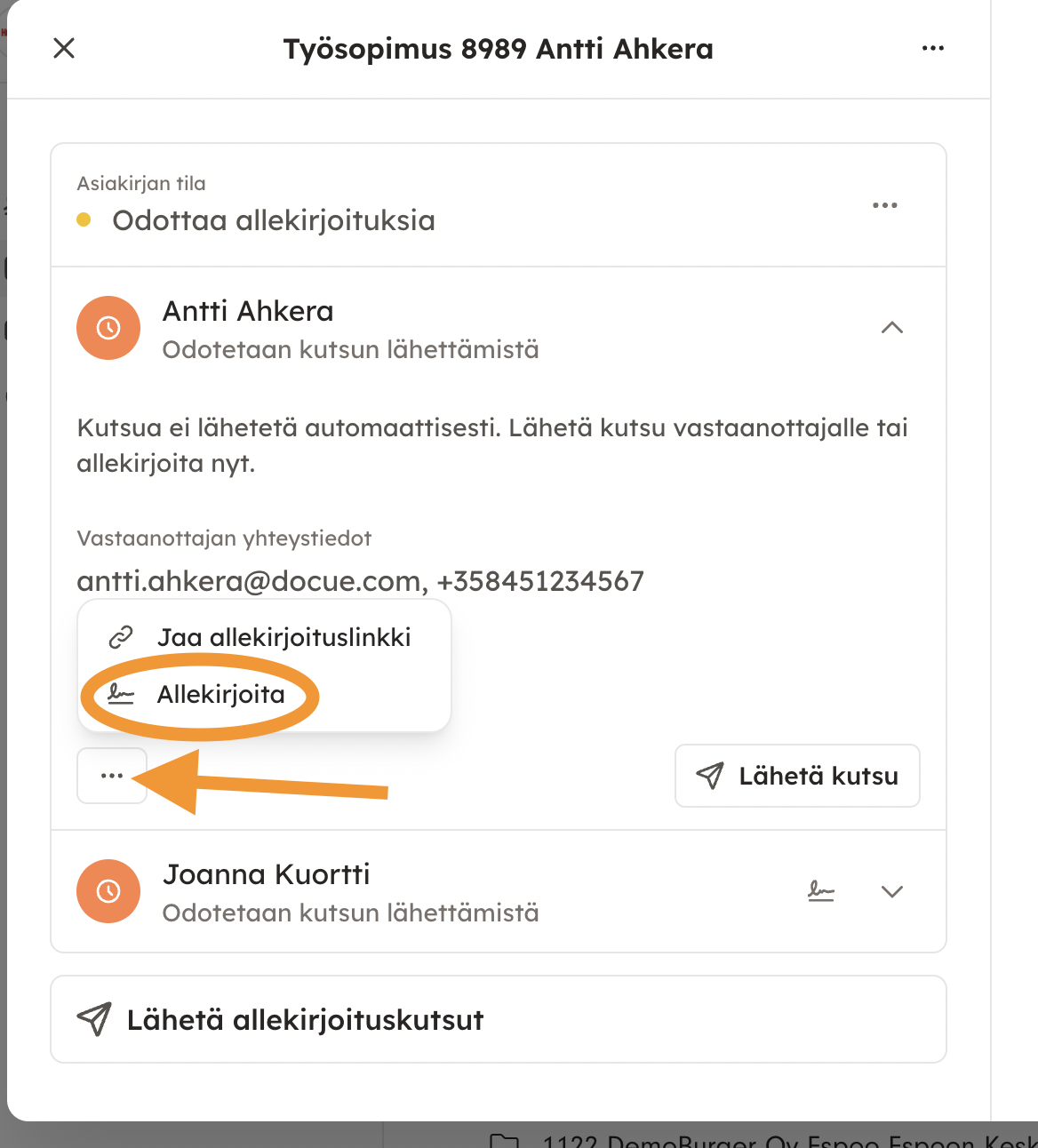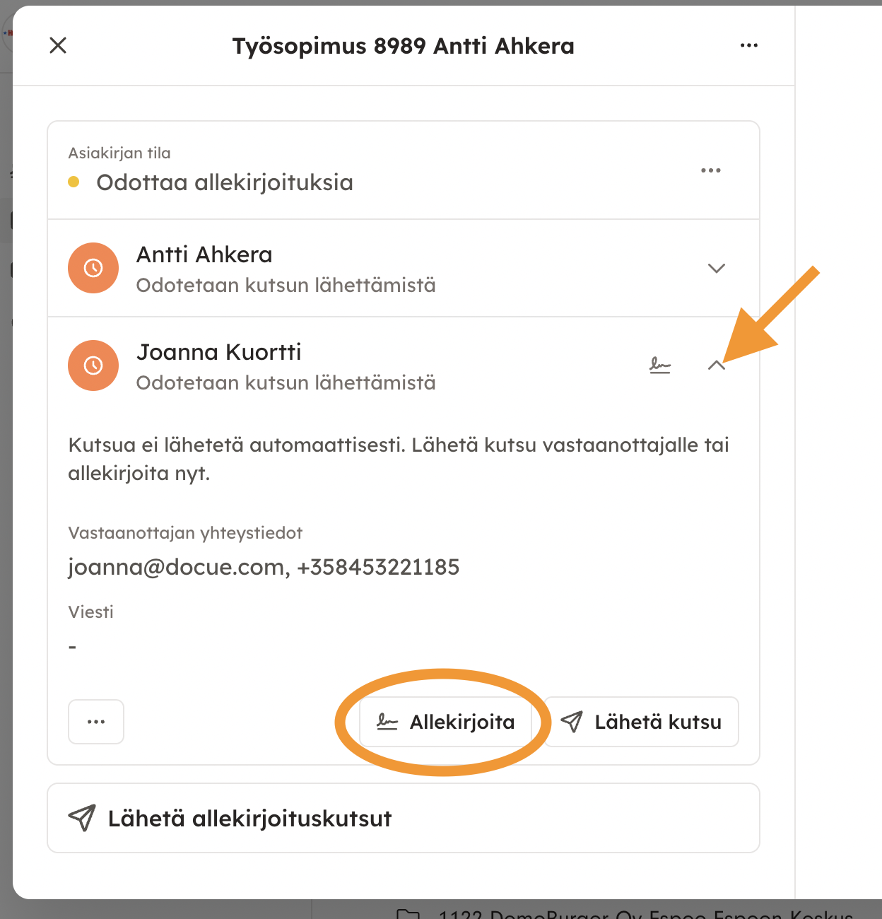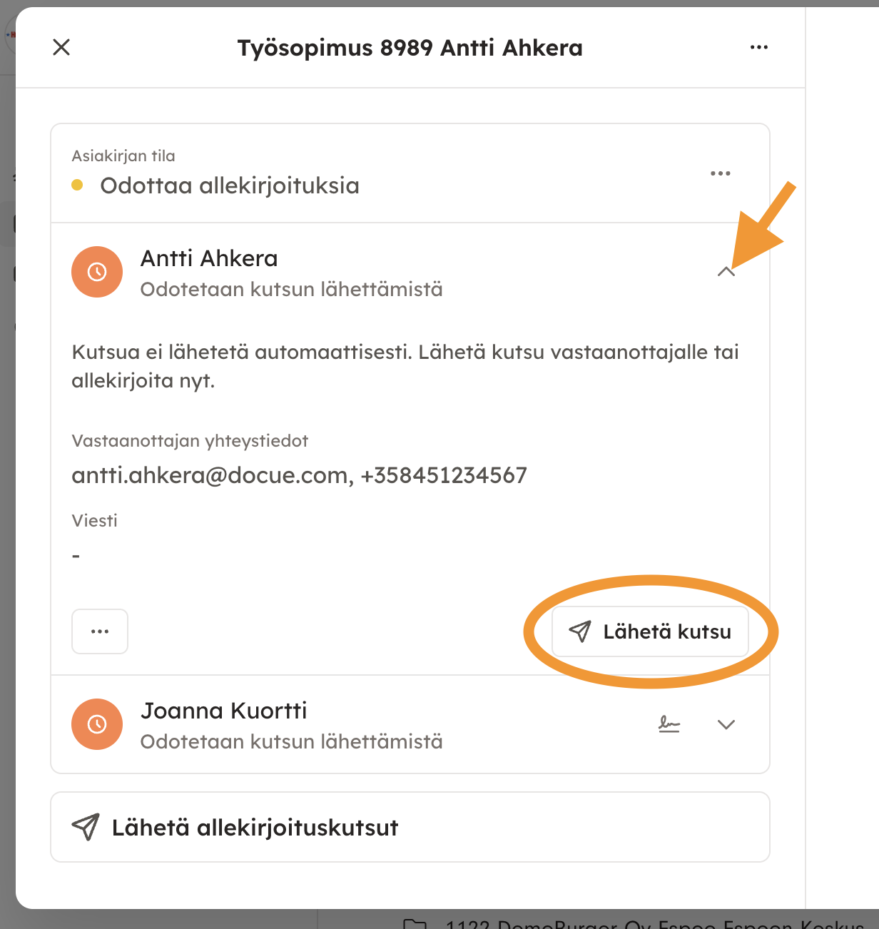 5. Kun olet allekirjoittanut asiakirjan, klikkaa työntekijän nimen kohdalla olevasta nuolesta ja valitse "Lähetä kutsu".