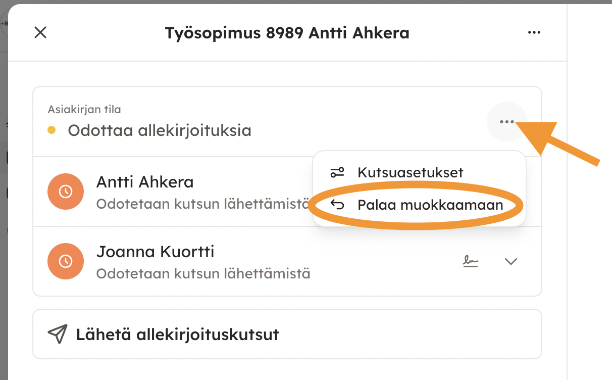 Huom. jos allekirjoitusvaiheessa vielä huomaat, että asiakirjaa tarvitsee muokata ennen allekirjoittamista, pääset takaisin laatimisnäkymään "Palaa muokkaamaan" -kohdasta niin kauan kun kaikki osapuolet eivät vielä ole allekirjoittaneet. Tällöin mahdolliset jo lähetetyt kutsut sekä toteutuneet allekirjoitukset mitätöityvät.