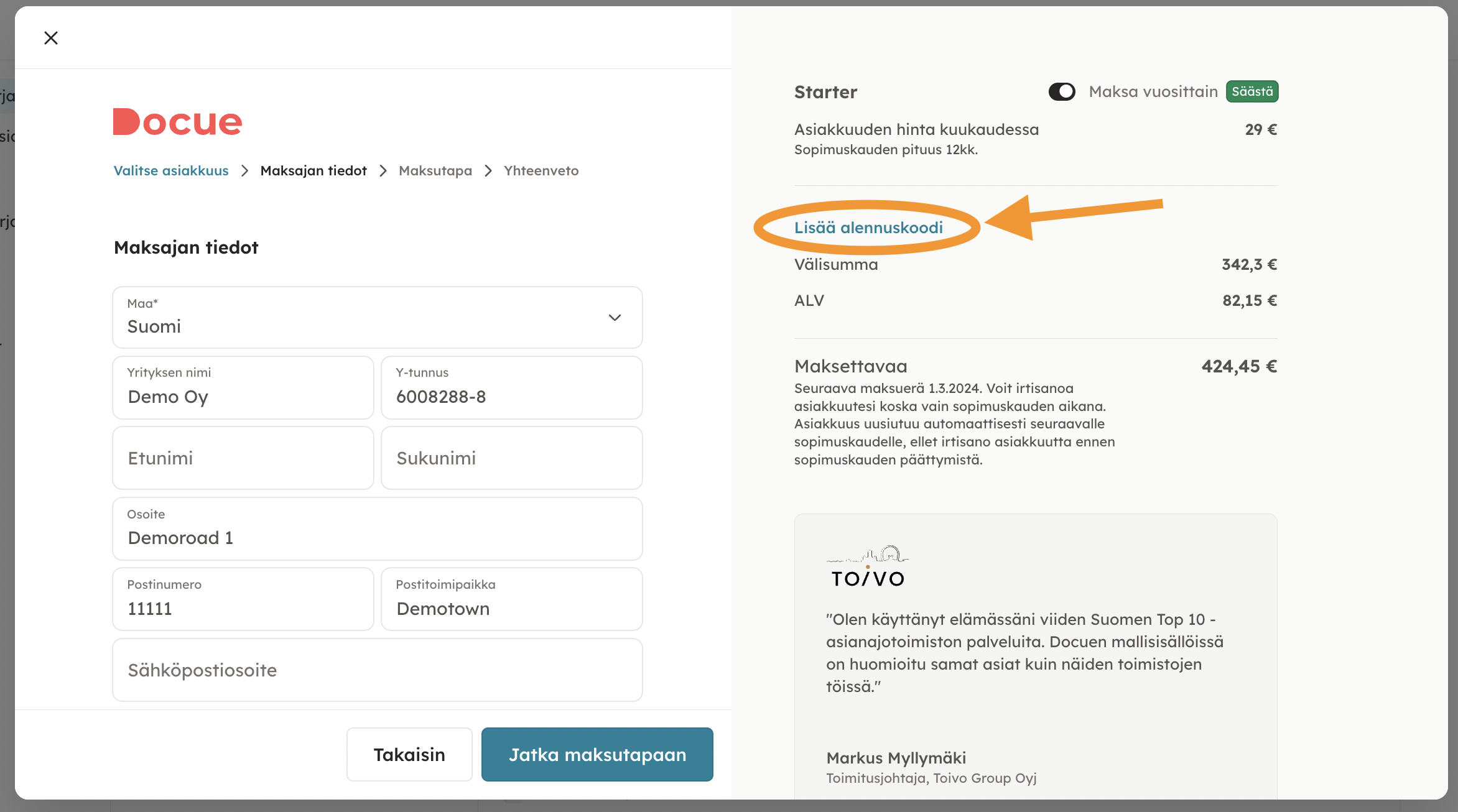 Alennuksen lunastaminen onnistuu syöttämällä ajantasaisen alennuskoodin tilauksen aktivoinnin yhteydessä alla olevan esimerkkikuvan mukaisesti. Alennuskoodi on saatavilla osoitteessa https://docue.com/fi-fi/nordnet. Huomioithan, että kertamaksulla ostettaviin asiakirjoihin hyödynnettävissä olevaa Nordnetin lahjakortin koodia ei voi hyödyntää vuositilauksen tilaamisen yhteydessä vaan koodit ovat erilliset.