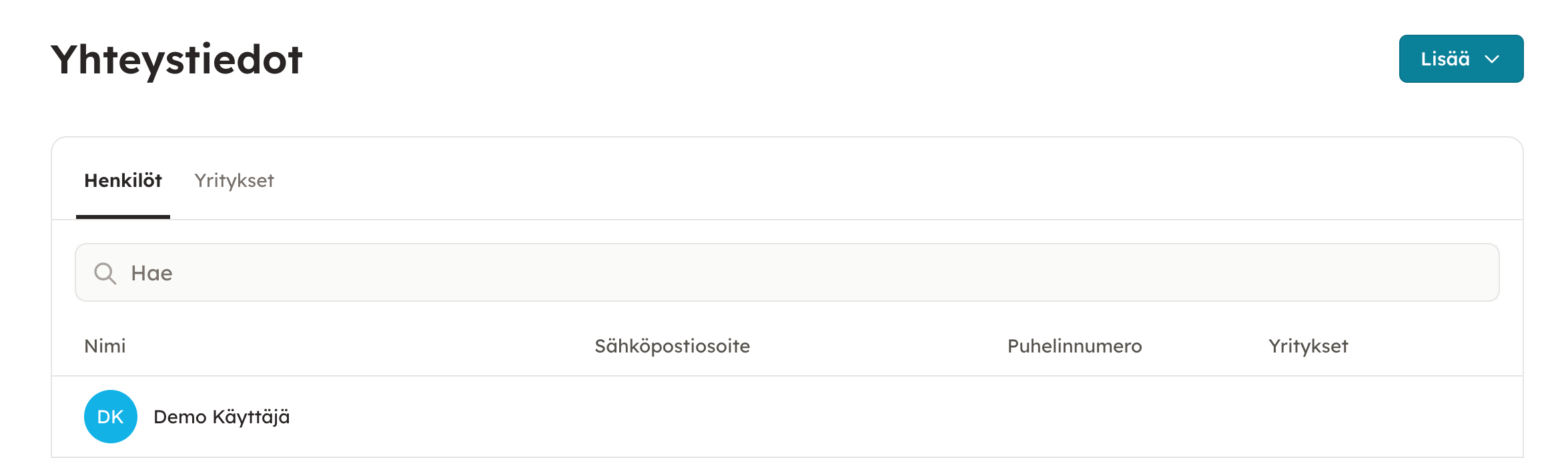 Avautuvasta näkymästä pääset hallinnoimaan ja lisäämään yhteystietoja. Voit tallentaa yhteystiedoiksi sekä henkilöitä että yrityksiä. Hae-toiminnon avulla voit hakea tiettyä yhteystietoa tallentamiesi henkilöiden ja yritysten joukosta.