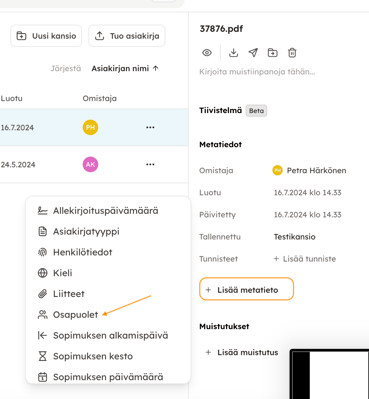 4. Asiakirjan lataamisen jälkeen voit lisätä metatietoja, jotta sopimusten hallinta on helpompaa. Avaa asiakirja ja valitse "+ Lisää metatieto". Näin voit lisätä asiakirjan tunnistukseen tärkeitä tietoja, kuten kyseiseen asiakirjan osapuolet. Kun lataat asiakirjan, se sisältää automaattisesti vain tiedot asiakirjan latauspäivästä ja asiakirjan ladanneesta henkilöstä.