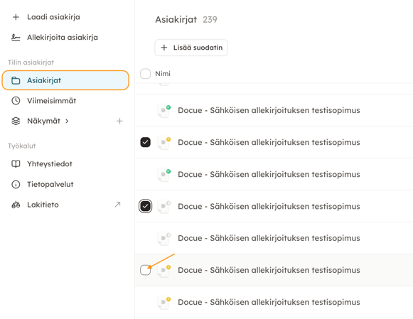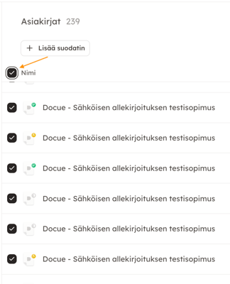 Voit joko yksitellen valita kaikki haluamasi asiakirjat klikkaamalla nimen vieressä olevaa ruutua